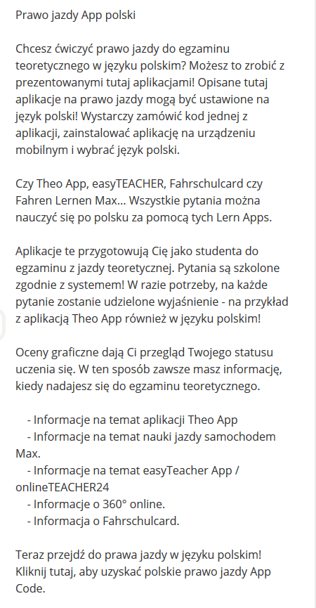 Egal ob die Theo App, easyTEACHER oder Fahrschulcard ... Alle Fragen können bei diesen Lern Apps auf polnisch gelernt werden.